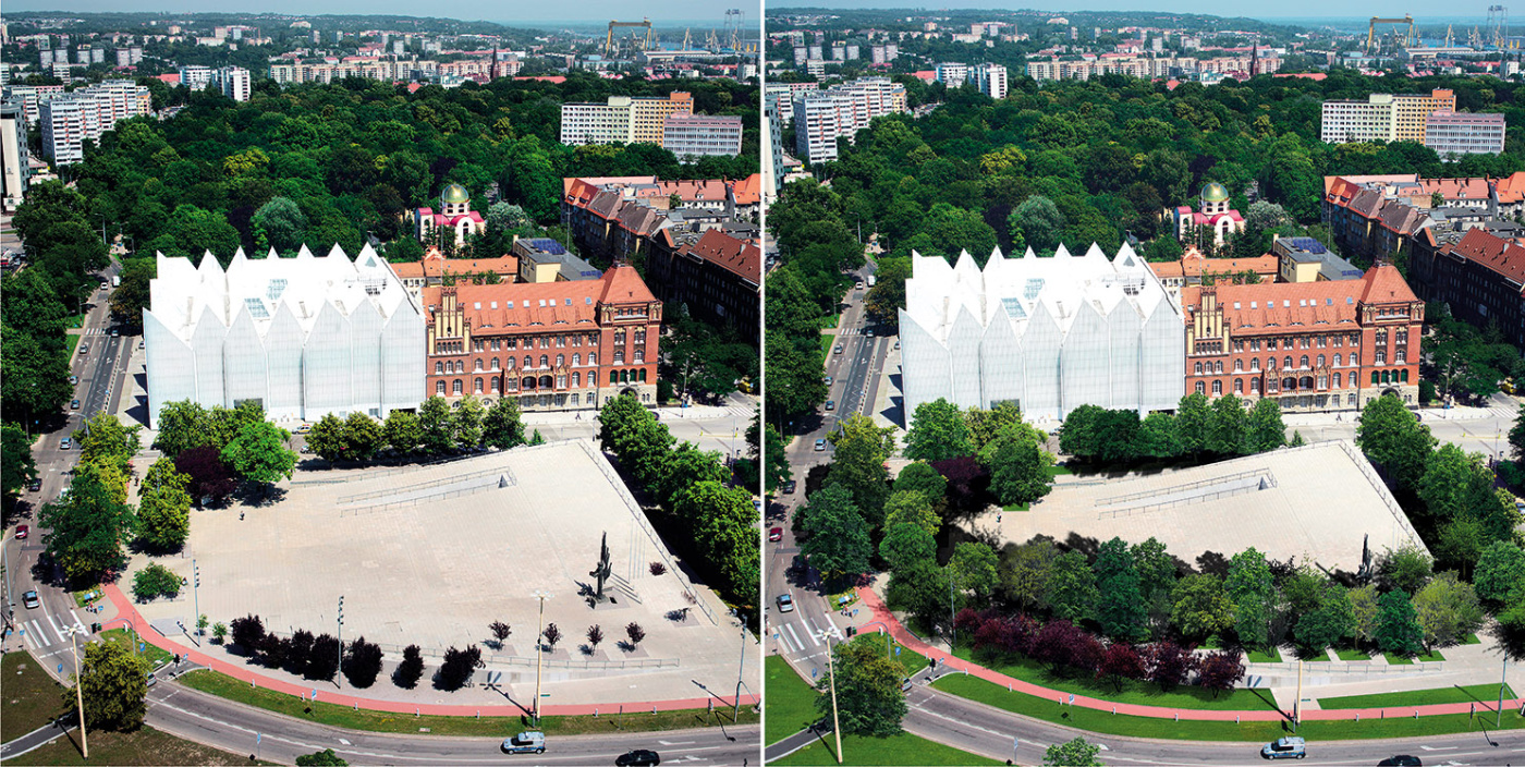 - Po to zeszliśmy z tym budynkiem pod ziemię, żeby nie zasłaniać Filharmonii. Ona była takim mocnym budynkiem formalnie, nie chcieliśmy, żeby te budynki nie rywalizowały ze sobą. teraz pomyśleliśmy, żeby nie niszczyć użytkowości tego placu, bo to fantastycznie działa, dosadźmy trochę drzew od strony Trasy Zamkowej, żeby dać trochę cienia latem, kiedy to jest potrzebne, ale tak, żeby plac dalej mógł działać tak jak działa.